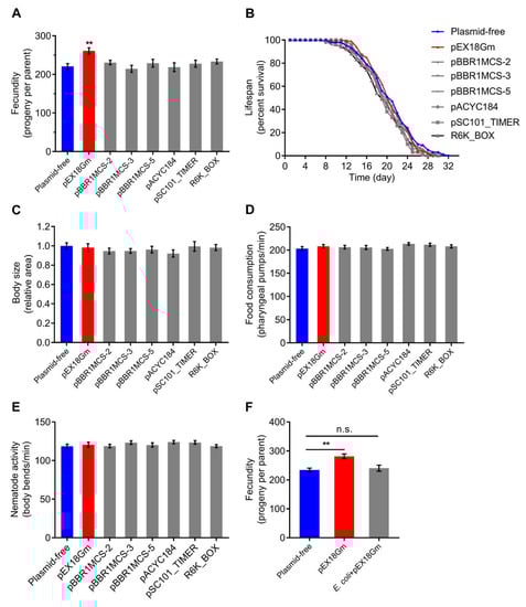 The response of C. elegans life-history traits to plasmids. Plasmid-free means E. coli OP50 does not harbor any plasmid. Different plasmids are indicated on the x axis. Plasmids were introduced into E. coli OP50 as a diet to feed C. elegans. (A) Fecundity of C. elegans on different diets. (B) Lifespan of adult animals fed different diets. (C) Relative body size of C. elegans on different diets. Animal body size was measured by ImageJ and was normalized to the body size of animals grown on the diet of plasmid-free E. coli OP50. (D) Food consumption of C. elegans on different diets. Food intake as measured by pharyngeal pumping rate. (E) Nematode activity of C. elegans on different diets. Animals’ activity as measured by body bending rate. (F) Fecundity of C. elegans directly fed on pEX18Gm plasmid. E. coli + pEX18Gm indicates the mixed diet that mixes E. coli OP50 with pEX18Gm plasmid in vitro (plasmid was extracted from an equal volume of E. coli OP50 harboring pEX18Gm). Error bars indicate ± standard error of the mean (SEM). ** p < 0.01 by Tukey’s multiple comparison test; n.s. indicates not significant.