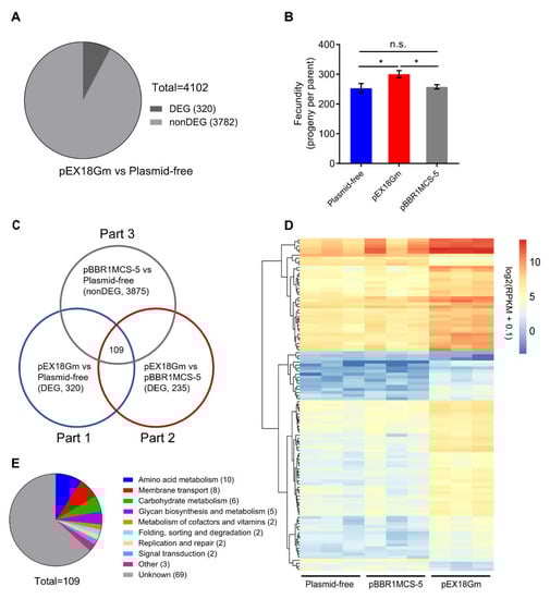 RNA-seq analysis of E. coli Strains. (A) Pie chart of comparing gene expression between E. coli OP50 (plasmid-free) and E. coli OP50 harboring plasmid pEX18Gm (pEX18Gm). DEG means significantly differentially expressed genes (p < 0.05 and |log2(fold change)| > 1.5); nonDEG means insignificantly differentially expressed genes. (B) C. elegans fecundity response to feeding on E. coli OP50 harboring pEX18Gm and pBBR1MCS-5, respectively. * p < 0.05 by Tukey’s multiple comparison test; n.s. indicates not significant. (C) Venn diagram of candidate gene screening. Part 1 means significant differential expression genes between E. coli OP50 harboring pEX18Gm and plasmid-free E. coli OP50. Part 2 means significant differential expression genes between E. coli OP50 harboring pEX18Gm and pBBR1MCS-5. Part 3 means insignificant differential expression genes between E. coli OP50 harboring pBBR1MCS-5 and plasmid-free E. coli OP50. (D) Heatmap of 109 candidate gene expression. Expression values (RPKM) were log2 transformed. See Table S1 for details. (E) Pie chart about KEGG functional annotation of candidate gene. See Table S1 for details.