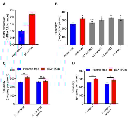 The bacterial methionine synthase metH is necessary for pEX18Gm-induced increase in C. elegans fecundity. (A) mRNA expression of gene metH in plasmid-free E. coli OP50 and E. coli OP50 harboring pEX18Gm. qRT-PCR data, normalized to the metH levels in E. coli OP50, the house-keeping gene used gapA. (B) Fecundity of C. elegans in E. coli OP50 diet on NGM plates supplemented with different concentrations of methionine (MET). (C) Effect of pEX18Gm plasmid on the fecundity of C. elegans grown on E. coli OP50 and mutants E. coli OP50 ΔmetH. metH indicates E. coli methionine synthase gene. (D) Effect of plasmid pEX18Gm on the fecundity of C. elegans Δmetr-1 mutant in E. coli OP50 diets. metr-1 indicates C. elegans methionine synthase gene. Error bars indicate ± SEM. * p < 0.05; ** p < 0.01 by Student’s t test (A,C,D) and Tukey’s multiple comparison test (B); n.s. indicates not significant.