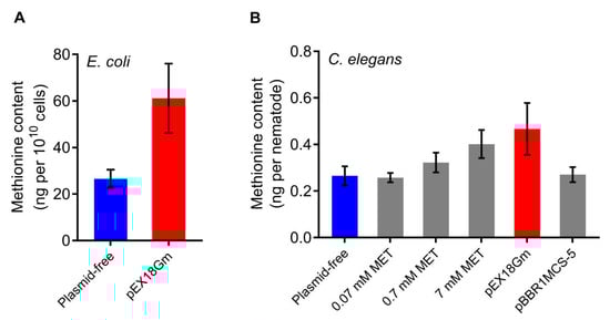 To confirm that methionine is the metabolite regulating C. elegans fecundity, we measured the content of methionine in E. coli and C. elegans by high performance liquid chromatography–tandem mass spectrometry (LC-MS/MS). We found that the methionine content in E. coli harboring pEX18Gm was 2.3 times higher than that in plasmid-free E. coli (Figure 4A). Moreover, the methionine content in C. elegans fed with E. coli OP50 harboring pEX18Gm was higher than that in C. elegans fed with plasmid-free E. coli OP50 (Figure 4B). Additionally, we found that methionine content in C. elegans was high in the 0.7 MET, 7 MET treatments, but not significantly changed in the 0.07 MET and pBBR1MCS-5 treatments, which is consistent with fecundity changes in different diets (Figure 2B, Figure 3B and Figure 4B). Taken together, these findings indicated that pEX18Gm-induced C. elegans fecundity changes are performed by regulating methionine in E. coli.