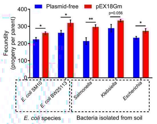 Effects of different bacterial species harboring plasmid pEX18Gm on C. elegans fecundity. Error bars indicate ± SEM. * p < 0.05; ** p < 0.01 by Student’s t test.