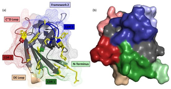 - Govaert, J.; Pellis, M.; Deschacht, N.; Vincke, C.; Conrath, K.; Muyldermans, S.; Saerens, D. Dual beneficial effect of interloop disulfide bond for single domain antibody fragments. J. Biol. Chem. 2012, 287, 1970–1979. [Google Scholar] [CrossRef] [PubMed]