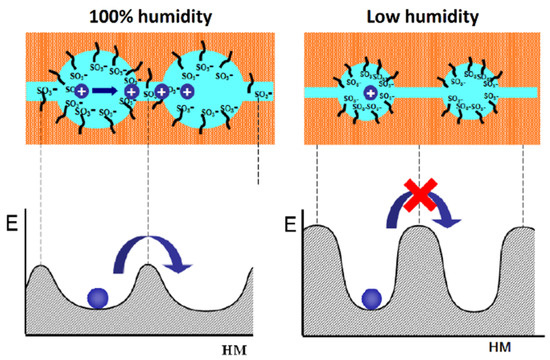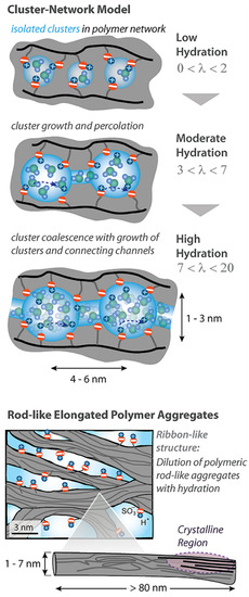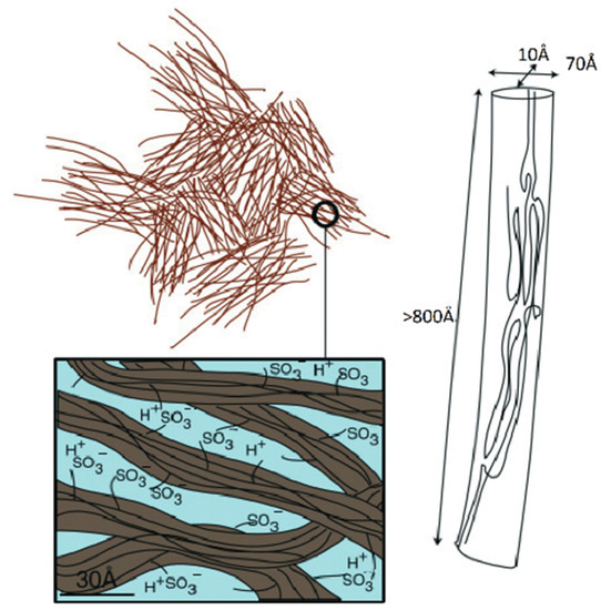 According to this nanostructure model, the macroscopic molecular and ionic transfer is controlled by water molecule and cation local jumping, which is in good agreement with the results in Table 1. This model was confirmed by the authors of [104] who proposed rod-like aggregates (Figure 5).