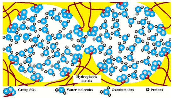 The so-called Gierke model was proposed on the basis of small angle X-ray scattering (SAXS) data. According to this model, sulfonate groups, mobile cations, and water molecules are associated in spherical clusters with a diameter of 5 nm or less depending on membrane humidity. The clusters connect to each other by narrow channels formed by solitary sulfonate groups, and the channel width is about 1 nm (Figure 1) [102].