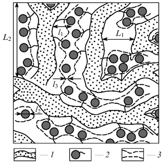 Structure of the amorphous part of the perfluorinated sulfonate cation-exchange membrane. (1) Polymer backbone; (2) hydrated counterions and functional groups at a low moisture content; (3) transport channels for ions and water molecules at a high moisture content; L1 = 4 nm according to small angle X-ray scattering (SAXS) data; L2 = 10 nm according to Mössbauer spectroscopy; l1 = l.2–1 nm according to ENDOR and relaxation NMR data; l3 = 1.5 nm according to standard porosimetry and ENDOR methods (adapted from [103]).
