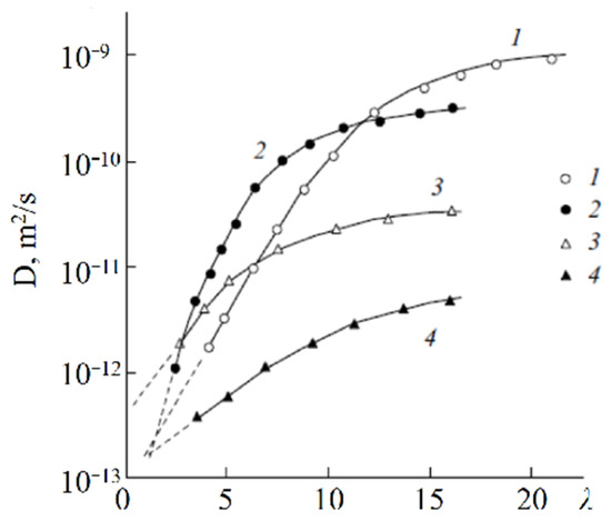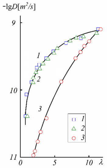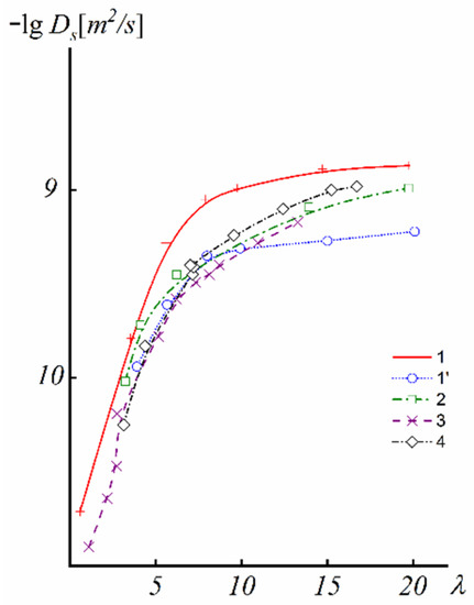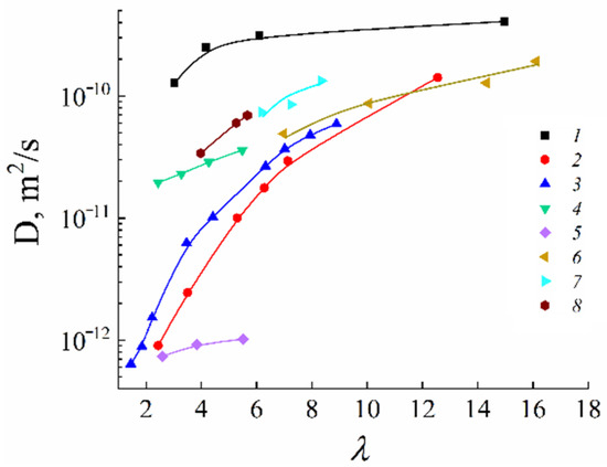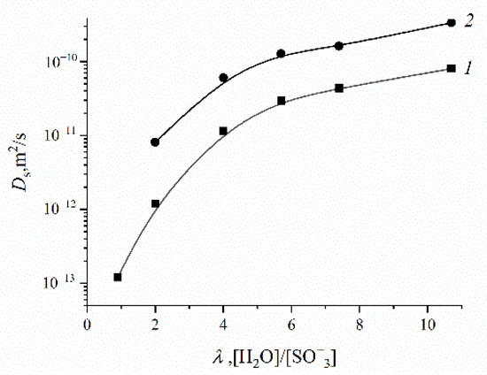 The next type of membrane is a membrane with sulfonate groups binding with styrene fragments. For these types of compositions, the calculated self-diffusion coefficient is higher compared with the macroscopic diffusion coefficient, as it is shown in Figure 6, where the dependences of water self-diffusion coefficients on humidity λ are shown for the sulfonated exchanger CU-2-8 (Russian analog of Dowex 50 W). Therefore, the cluster channel model of the nanostructure (particularly, the model in Figure 2) is suitable for ionic molecular transfer explanation. This model is especially reasonable for ion exchangers based on styrene–divinylbenzene crosslinked copolymers. Namely, rather narrow channels are formed in the crosslinked fragments of polystyrene chains [33].