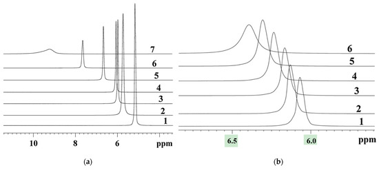 where δh is the chemical shift of protons of the hydrated cation, ph is the relative part of hydrated cation protons; is the bulk water chemical shift, and is the bulk water relative part. The hydration numbers can be calculated from Equations (3) and (4) [25,41]. For the acid membrane ionic form: