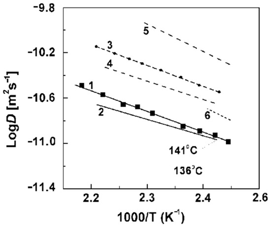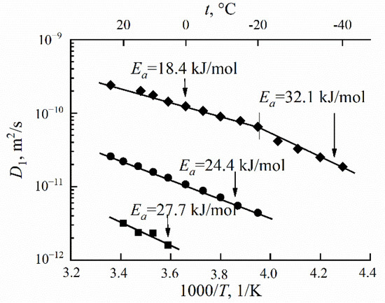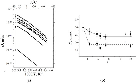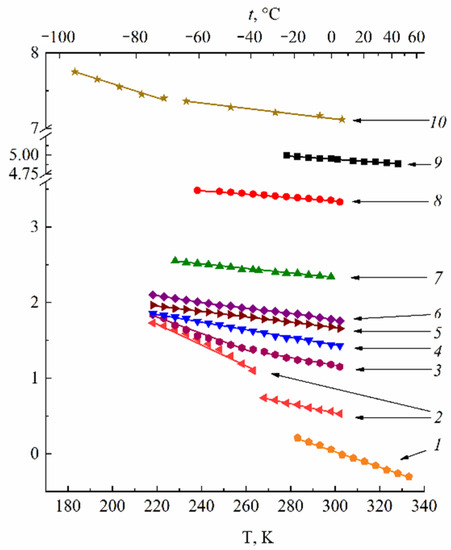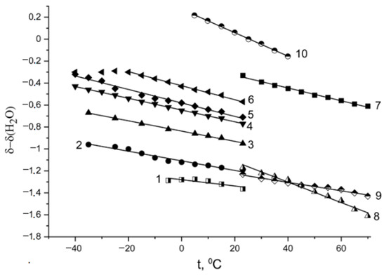 These dependences are straight lines from −55 °C to 50 °C for λ < 7.4 (curves 4–9). For higher λ, this dependence slope increases in the freezing temperature range (curves 2 and3, Figure 8). The same shape of the chemical shift temperature dependence was observed for the Nafion NRE-212 membrane (curve 10, Figure 8) [75].