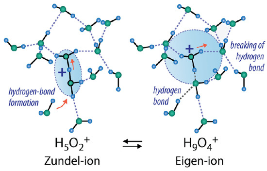In the acidic ionic form, the 1H line width is narrow even after the Nafion membrane was dried to a constant weight, indicating a high proton mobility under these conditions. The direct NMR measurements of the water content show that two residual water molecules remained after drying to form the hydroxonium (Zundel) ion H5O2+, which explains a high proton mobility [41]. In Table 2, the H+ hydration numbers calculated from Equation (3) are given. The absolute value λ with a glance at two residual water molecules is indicated in Figure 8 and Table 2. At a low water content (λ < 3–4), h is about 2, but with increasing humidity (λ > 6) H9O4+ (Eigen-ion) is formed (Figure 9) [58].