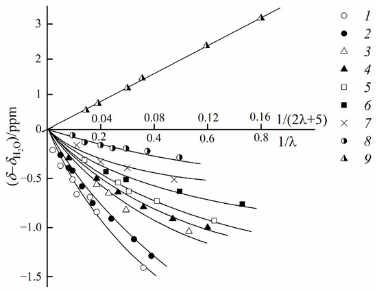 Dependences of chemical shifts of water on the moisture content of the MF-4SC membrane. Membrane ionic form: (1) Li+, (2) Na+, (3) K+, (4) Rb+, (5) Cs+, (6) Ba2+, (7) Ca2+, (8) Mg2+, (9) H+ (adapted from [36]).
