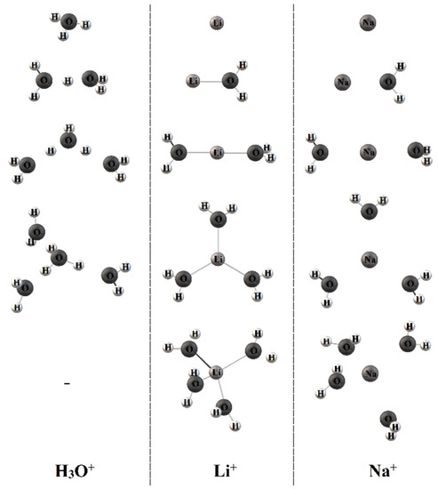 Optimized geometries of the X+(H2O)n clusters, where X+ is H+, Li+, and Na+ cations. Reprinted with permission from Ref. [74]. Copyright © 2022 American Chemical Society.