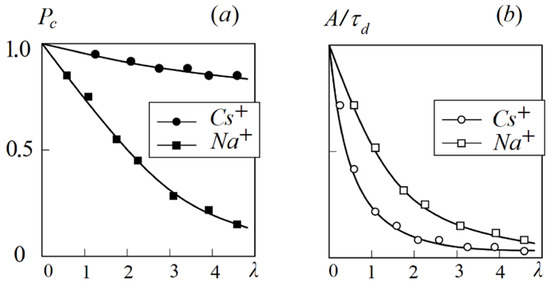 In Figure 13, the dependences of contact ionic pairs Pc (a) and relative ionic mobility τd (b) of Na+ and Cs+ cations on the water molecule amount per SO3− group λ is shown. The value of Pc is lower, but the translation jumping frequency A/τd is higher for the sodium cation as compared to the cesium cation.