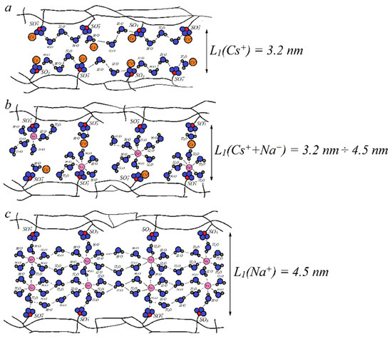 Schematic representation of the Nafion membrane ionogenic channel fragment. Membrane ionic form: (a) Cs+, (b) mixture Cs+/Na+, (c) Na+, where