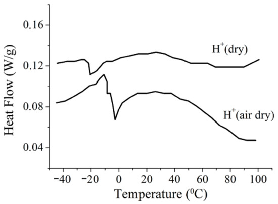 DSC thermograms in H+ ionic forms of perfluorinated sulfo cation-exchange MF-4SC membrane, which is a complete analog of Nafion. “Dry” means that the sample was dried to a constant weight at 120 °C (λ is about 2 water molecules per sulfonate group), “air dry” means the sample dried to a constant weight at room temperature (λ is about 5 water molecules per sulfonate group). Adapted from [44].
