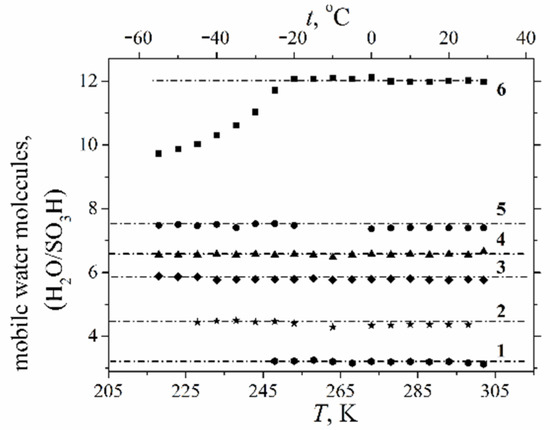 Dependences of the mobile water molecule amount in the acidic form of the Nafion 117 membrane on temperature at different water contents: (1) λ = 3.2 ± 0.4; (2) λ = 4.4 ± 0.4; (3) λ = 5.8 ± 0.4; (4) λ = 6.4 ± 0.4; (5) λ = 7.4 ± 0.4; (6) λ = 12 ± 0.4. Reprinted with permission from Ref. [41]. Copyright © 2022 Springer-Verlag GmbH Austria, part of Springer Nature.