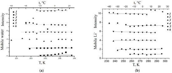 Dependences of the number of mobile water molecules per sulfonated group λ (a) and mobile Li+ cations (b) on temperature in the lithium ionic form of the Nafion 117 membrane; (a) amount of mobile water molecules per sulfonate group: (1) λ = 0.9, (2) λ = 2.0, (3) λ = 4.0, (4) λ = 5.7, (5) λ = 7.4, (6) λ = 10.7. (b) Relative intensity of 7Li+ mobile signals: (1) λ = 0.9, (2) λ = 2.0, (3) λ = 4.0, (4) λ = 5.7, (5) λ = 7.4, (6) λ = 10.7. Reprinted with permission from Ref. [24]. Copyright 2021 MDPI.