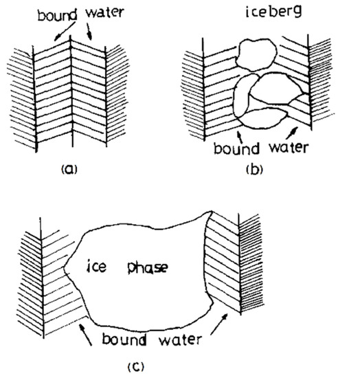 Schematic fragments in two channelsC at the temperature below 0 °C: (a) narrow pores (2–10 nm)—water is bound to the pore walls and cannot transform into ice; (b) increased pore width—water molecules, that are far from the pore walls, tend to transform into microcrystals of ice; (c) a separate ice phase. Reprinted with permission from Ref. [108]. Copyright © 2022 Published by Elsevier B.V.