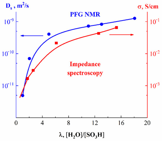 As mentioned above, it should be concluded that Nafion macroscopic transport is carried out by local jumping of water molecules and cations between neighboring sulfonate groups. Therefore, ion transport is determined by ionogenic group hydration. For this reason, the hydration character should be correlated with the translational diffusion mobility of water molecules and cations, as well as membrane ionic conductivity.