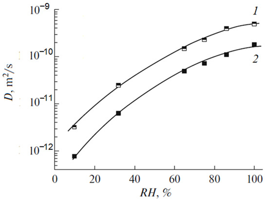 Humidity dependences of the water self-diffusion coefficients in the acid ionic form of the sulfo cation exchanger CU-2-8 (Russian analog of Dowex 50 W). 1, 2, calculated from Equation (1); 3, measured by PFG NMR. 1, sample swelled in H2O; 2, sample swelled in D2O, signal of residual protons was recorded (adapted from [33]).