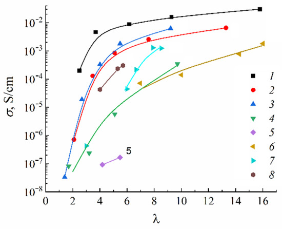 In Table 3, the h values of Li+ calculated from Equation (4) at different λ are indicated. As shown in Table 3, at λ < 10.7 hydration number h of the Li+ cation is lower than (4), which is equal to h for aqueous salt solutions. Hydration numbers for Na+ and Cs+ cations at the maximum water content are 6 ± 1 (λ = 10 at 98% RH) and 1 ± 0.2 (λ = 4 at 98% RH), respectively [60].