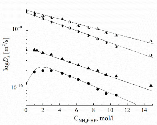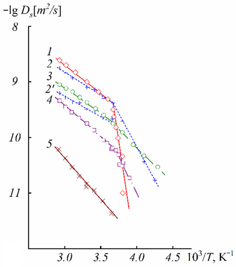 In Figure 11, these dependences for H+, alkaline, and alkaline-earth metal cations in the perfluorinated sulfo cation-exchange membrane MF-4SC are shown.