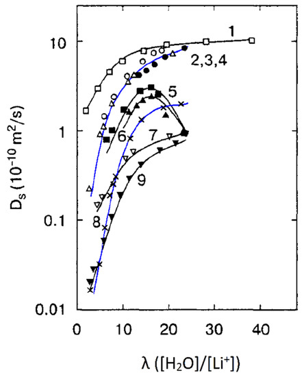 As shown in Figure 17, water and Li+ cations are mobile at −40 °C at λ ≤ 10.7.