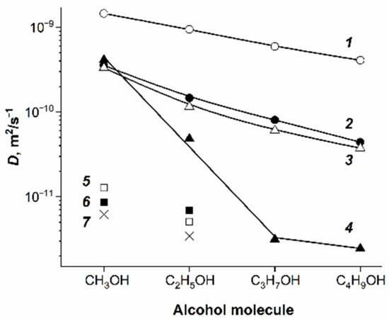 - Volkov, V.I.; Korochtkova, S.A.; Timashev, S.F. Characteristics of Self-Diffusion of Aliphatic Monoatomic Alcohols in Perfluorinated Sulfocationite Membranes. Russ. J. Phys. Chem. 1995, 69, 1124–1129. [Google Scholar]