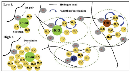Hydration numbers h of Li+ cation in the lithium form of the Nafion 117 membrane at different water contents λ. Reprinted with permission from Ref. [60]. Copyright © 2022 Elsevier B.V. All rights reserved.