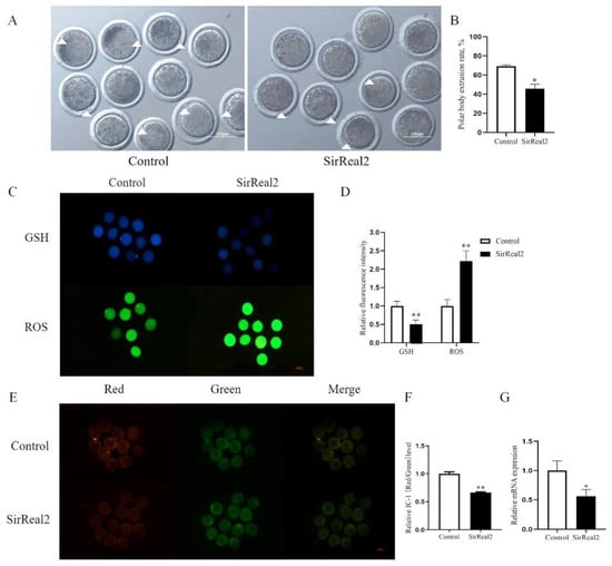 Inhibition of SIRT2 in oocytes affects maturation rate, GSH, ROS, and mitochondrial membrane potential. (A) Representative images of oocyte maturation after Sirt2 inhibition. The white triangle represents the extrusion of the polar body. Bar = 100 μm. (B) The maturation rate after inhibition of SIRT2 in oocytes. (C) Representative images of GSH and ROS after SIRT2 inhibition in oocytes. Bar = 100 μm. (D) The relative levels of GSH and ROS in oocytes after SIRT2 was inhibited. (E) Red and green fluorescent images of JC-1 staining after inhibiting SIRT2 in oocytes. Bar = 100 μm. (F) The relative level of JC-1 after inhibiting SIRT2 in oocytes. (G) Sirt2 mRNA level after Sirt2 inhibition. The graph shows the mean ± SEM of the results obtained in three independent experiments. *, significant difference (p < 0.05). **, significant difference (p < 0.01).