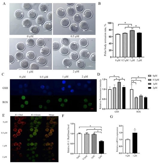 Resveratrol affects maturation rate, GSH, ROS, and mitochondrial membrane potential in oocytes. (A) Representative images of oocyte maturation after resveratrol treatment. The white triangle represents the extrusion of the polar body. Bar = 100 μm. (B) The maturation rate after treatment with different concentrations of resveratrol in oocytes. (C) Representative images of GSH and ROS after treatment with different concentrations of resveratrol in oocytes. Bar = 100 μm. (D) The relative levels of GSH and ROS in oocytes after treatment with different concentrations of resveratrol. (E) Red and green fluorescent images of JC-1 staining after treatment with different concentrations of resveratrol in oocytes. Bar = 100 μm. (F) The relative level of JC-1 after treatment with different concentrations of resveratrol in oocytes. (G) Sirt2 mRNA level after 1μM resveratrol treatment. The graph shows the mean ± SEM of the results obtained in three independent experiments. *, significant difference (p < 0.05).