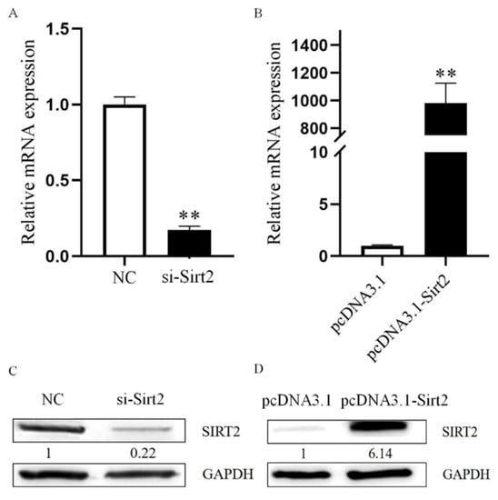 Determination of Sirt2 knockdown and overexpression efficiency in present study. (A) Detection of mRNA level of Sirt2 by qRT-PCR after siRNA knockdown. (B) Detection of mRNA level of Sirt2 by qRT-PCR after overexpression. (C) Detection of protein level of SIRT2 by Western blot after siRNA knockdown. (D) Detection of protein level of SIRT2 by Western blot after overexpression. **, significant difference (p < 0.01). The results were obtained in three independent experiments.