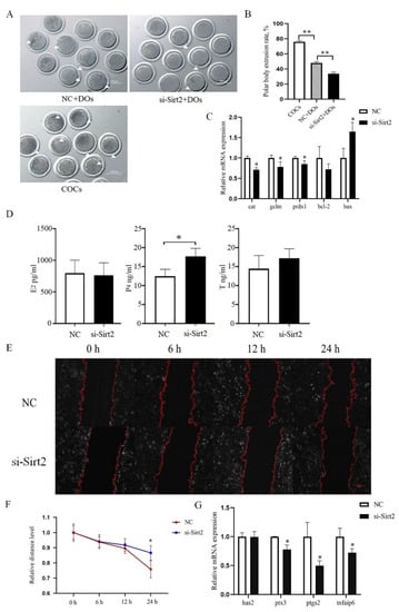 Next, cell migration and expansion-related gene expression of granulosa cells were also examined. Results of the scratch experiments showed that the width of scratches increased significantly after Sirt2 knockdown (p < 0.05, Figure 4E,F). Correspondingly, the mRNA abundance of expansion marker genes ptx3, ptgs2, and tnfaip6 were significantly lower in the Sirt2-knockdown group (p < 0.05, Figure 4G). These data suggest that Sirt2 plays a critical role in sheep oocyte in vitro maturation by affecting the apoptosis, expansion, and secretion function of granulosa cells.