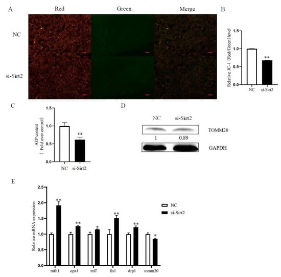 Mitochondrial membrane potential and ATP production are indicators of mitochondrial function. To explore the function of SIRT2 on mitochondrial of granulosa cells, we tested its mitochondrial membrane potential level and ATP production. Our results indicated that the red/green fluorescence ratio of JC-1 and ATP content were both significantly decreased in the Sirt2 knockdown group (p < 0.01, Figure 5A–C). Next, to measure the mitochondrial quality, the amount of TOMM20 was tested by Western blot analysis, and the amount of TOMM20 decreased after Sirt2 knockdown (Figure 5D). Then, we further detected the expression of mitochondrial fusion and fission genes and found that SIRT2 knockdown significantly increased the expression of mitochondrial fusion genes mfn1, opa1, and mitochondrial fission genes fis1 and drp1 (p < 0.01, Figure 5E), and the mRNA abundance of tomm20 was significantly reduced (p < 0.05, Figure 5E). These results indicate that Sirt2 is required for the dynamic balance of mitochondrial fusion and fission and mitochondrial quality.