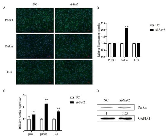 As Sirt2 knockdown caused mitochondrial dysfunction, we tried to determine whether it had an impact on mitophagy. The immunofluorescence results showed a significant increase of Parkin in Sirt2 knockdown group (p < 0.01, Figure 7A,B), and the qPCR and Western blot analysis result showed that the mRNA and protein level of Parkin were both significantly increased (p < 0.01, Figure 7C,D). Surprisingly, no significant change was found in Parkin level after Sirt2 overexpressed (p > 0.05, Figure 8).