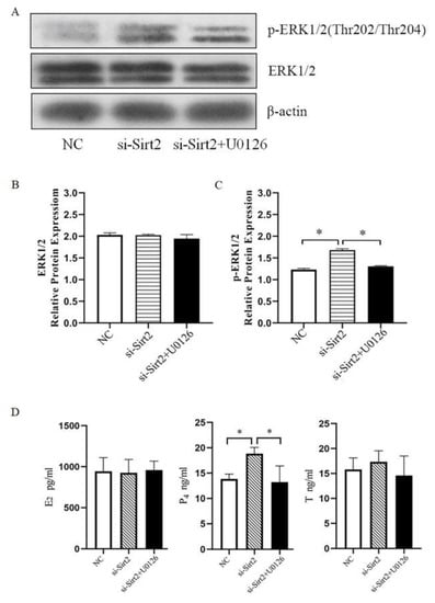 To further explore the mechanism of effect of Sirt2 on steroid hormones secretion, we tried to determine whether Sirt2 influenced the ERK1/2 pathway, which showed involvement in the steroid hormone secretion process []. Western blot results showed that Sirt2 knockdown had no significant effect on protein level of ERK1/2, but it activated protein of p-ERK1/2. However, on the basis of Sirt2 knockdown, treatment with U0126, an ERK1/2 pathway inhibitor, significantly reduced the expression of p-ERK1/2 (p < 0.05, Figure 9A–C), indicating that Sirt2 is involved in the regulation of ERK1/2 signaling pathway. To further prove our hypothesis, we tested whether Sirt2 affects steroid hormone secretion through regulating the ERK1/2 pathway. The results showed that U0126 treatment could compensate for the increase of P4 caused by Sirt2 knockdown (p < 0.05, Figure 9D). These results indicate that Sirt2 can regulate the secretion of P4 through ERK1/2 pathway.