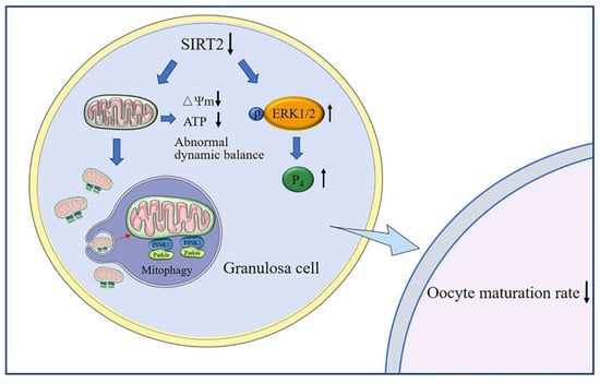 Mechanism of SIRT2 influencing sheep oocyte maturation through regulating surrounding granulosa cells. SIRT2 in granulosa cells is required for sheep oocyte maturation by affecting mitochondrial membrane potential and ATP level, mitophagy, and increasing the P4 secretion through regulating p-ERK1/2.