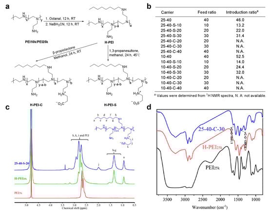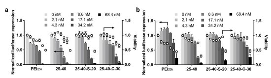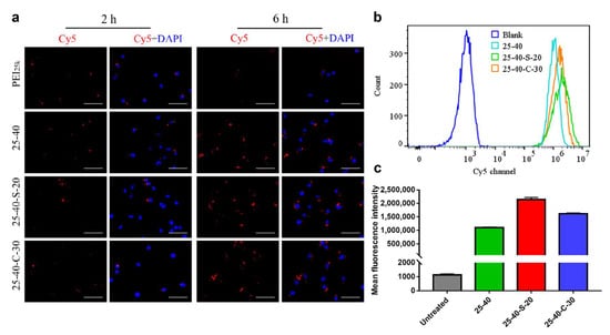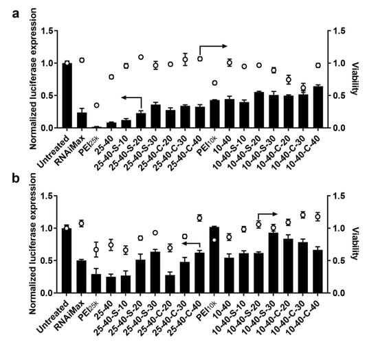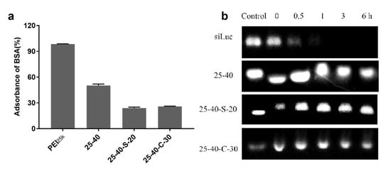 - Shen, W.; Wang, H.; Ling-Hu, Y.; Lv, J.; Chang, H.; Cheng, Y. Screening of efficient polymers for siRNA delivery in a library of hydrophobically modified polyethyleneimines. J. Mater. Chem. B 2016, 4, 6468–6474. [Google Scholar] [CrossRef] [PubMed]