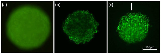 Spheroids of CHO-pAcGFP1-Mem cells recorded by conventional fluorescence microscopy (a), CLSM (b) and LSFM (c). Single planes are selected in (b,c) at a depth of 60 µm from the top of the spheroid; the arrow indicates the direction of light incidence in LSFM (excitation wavelength: 488 nm; fluorescence detected at λ ≥ 505 nm). Light intensity is reduced in the central part of the spheroid (b), and scattering increases along the light path (c). Reproduced from [30] with modifications.