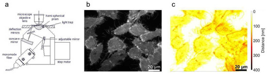 In contrast to CLSM and LSFM, Total Internal Reflection Microscopy (TIRFM) [20] represents a method that is designed for studies of cell surfaces, in particular their plasma membranes. The method is based on the total internal reflection of a laser beam on a cell-substrate surface, thus generating an evanescent electromagnetic field that penetrates about 100 nm into the sample and permits selective excitation of membrane-proximal fluorophores. Two illumination concepts for TIRFM are reported in the literature: prism-type TIRFM, where light is incident on a cell layer via a glass prism, as shown in Figure 2a, and objective-type TIRFM, where laser light is focused close to the edge of the aperture of a high-aperture microscope objective lens. In both cases, the condition for the angle of light incidence Θ ≥ arcsin (n2/n1) has to be fulfilled with n1 corresponding to the refractive index of the glass substrate and n2 to that of the cell, namely the cytoplasm. As previously shown [34,35], variation of the angle of incidence (VA-TIRFM) permits the calculation of 3D cell-substrate topology with nanometer precision, e.g., upon application of cytotoxic or phototoxic agents. Furthermore, tumor cells and less malignant cells could be distinguished on the basis of prism-based VA-TIRFM [35]. Figure 2 shows a TIRFM image of Chinese Hamster Ovary (CHO) cells transfected with membrane-associated Green Fluorescent protein (GFP-Mem) incubated for 2 h with the cytostatic drug doxorubicin (2 µM, b) as well as cell-substrate topology calculated from a series of TIRFM images at 66° ≤ Θ ≤ 75° (c). More detailed experiments revealed that cell-substrate distances increased with the incubation time of doxorubicin. This may possibly be regarded as an early response to the application of this cytotoxic drug.