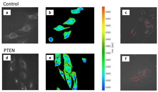 Fluorescence Lifetime Imaging Microscopy (FLIM) [49,50] upon excitation with short laser pulses is another technique that provides additional information about molecular conformations or interactions with adjacent molecules. The lifetime τ of an excited molecular state, also termed “fluorescence lifetime”, corresponds to the reciprocal of its rates of deactivation k = kF + kNR + kET, with kF representing radiative (fluorescent) transitions, kNR non-radiative transitions and kET energy transfer to adjacent molecules. Therefore, changes in the lifetime τ may reflect changes in molecular conformation or of the micro-environment of a molecule, singlet-triplet intersystem crossing (all via changes of kNR) or non-radiative energy transfer in the nanometer range. Figure 4 shows conventional autofluorescence images (a), fluorescence lifetime images (b) and Raman images (c) of U251-MG glioblastoma cells (controls and cells after application of the tumor differentiating agent PTEN, which is known to reduce the malignancy of the cells). Fluorescence images are dominated by the coenzyme nicotinamide adenine dinucleotide (NADH) [51] and are independent of the application of PTEN. In contrast, fluorescence lifetimes (again from NADH) appear slightly prolonged after the application of tumor differentiating agents, while Raman spectra are again quite similar. This suggests that fluorescence lifetimes (in addition to fluorescence spectra, not shown) may be an indicator of cell malignancy.