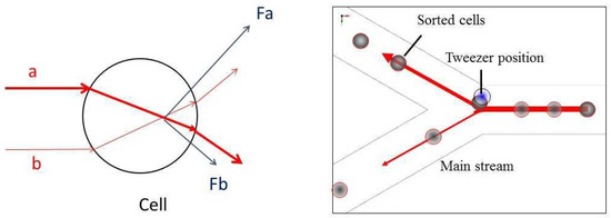 So far, laser applications for microscopic imaging have been reported, where the wavelength λ of radiation or the photon energy W = h c/λ served as key parameters (with Planck’s constant h = 6.626 × 10−34 Js and the velocity of light c = 3.00 × 108 m/s). However, photons also possess a momentum p = h/λ, which is rather small, but if a large number of photons is focused on a sub-micrometer laser spot, repulsive forces in the range of pico-Newtons to nano-Newtons are generated, which create a local pressure up to about 103 N/m2 that is sufficient for moving particles such as cells or organelles. This is demonstrated in Figure 5 for the case that a large number of photons a (from the center of a laser beam) and a smaller number of photons b (from a peripheral part of the laser beam) are deflected by a transparent particle, e.g., a cell. This principle of optical trapping has been referred to as “optical tweezers” [21] with numerous applications dating back more than 30 years. Pilot applications include measurements of motility forces of cells [52], macromolecules [53] or organelles [21], micro-manipulation of cells or chromosomes [54], laser-assisted cell fusion [55], or sperm insertion into oocytes through a previously drilled hole [56]. Figure 5 shows an application of laser tweezers for cell sorting [57] using a specific channel structure on a glass chip. Cells are flowing in a main stream, but upon activation of an optical tweezer system by an appropriate trigger, they are deflected to a side channel, where they can be recovered and further analyzed. Cell survival in a laser trap—dependent on the laser wavelength and radiant exposure—is an important issue. Detailed studies are reported in the literature [58], but generally, for the far red or near-infrared spectral range, light exposures up to some hundred MJ/cm2 appear possible [59]. Since only very small areas of a cell are irradiated, these light doses are considerably higher than upon irradiation of whole cells.