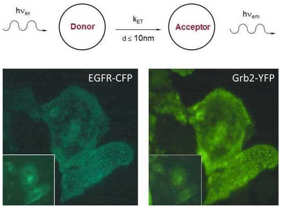 An example is given in Figure 6 showing the principle as well as an application of FRET from the Epidermal Growth Factor Receptor (EGFR) fused with Cyan Fluorescent Protein (CFP) to the growth factor receptor-bound protein 2 (Grb2) fused with Yellow Fluorescent Protein (YFP). If the fluorescent proteins are closer to each other than about 10 nm, non-radiative energy transfer occurs from the donor EGFR-CFP to the acceptor Grb2-YFP, and upon optical excitation of the donor, both donor and acceptor fluoresce. This is shown in Figure 6 for Total Internal Reflection Microscopy (TIRFM) and conventional wide-field microscopy (insets). Obviously, TIRFM enhances the signal/background ratio for this membrane-specific interaction. For quantitative evaluation, fluorescence spectra (ratio of acceptor/donor emission) as well as the fluorescence lifetime of the donor, which is shortened by FRET, can be used, as further described in [66]. FRET was probably stimulated in focal adhesions by the Epidermal Growth Factor (EGF) and possibly reduced by EGFR phosphorylation inhibitors. This opens the possibility to use this FRET sensor for a pharmacological test system, e.g., by replacing the fluorescence microscope with a multi-well reader system for simultaneous detection of a larger number of samples. In [66], a Total Internal Reflection (TIR) is described for a 96-well microtiter plate with a super-continuum picosecond fibre laser used for simultaneous excitation of all samples.