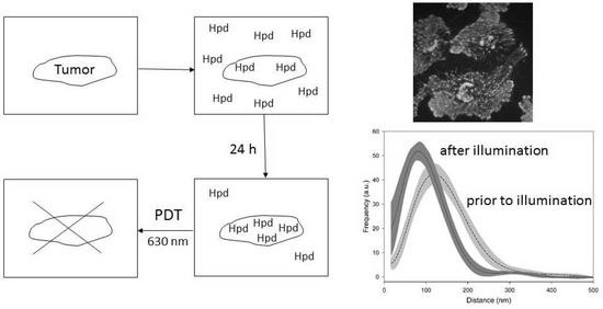 Photodynamic therapy (PDT): Principle of accumulation of a photosensitizer (here: Hpd) in a tumor and light-induced tumor destruction (left); membrane-associated 5-ALA-induced Protoporphyrin IX fluorescence in U373-MG glioblastoma cells assessed by TIRFM (upper right); cell-substrate topology prior and subsequent to illumination with red light (630 nm, 4 J/cm2), as evaluated from VA-TIRFM images at λ ≥ 590 nm. Median values ± median absolute deviations (MADs) were obtained from 10 independent experiments of cell-substrate topology each (lower right). Reproduced from [83] with modifications.