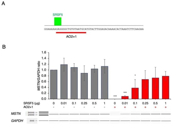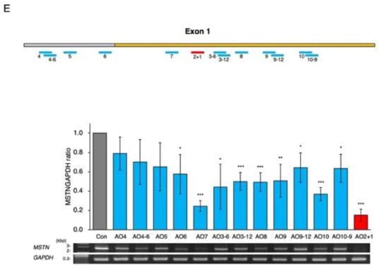 Chicago/Turabian StyleMaeta, Kazuhiro, Manal Farea, Hisahide Nishio, and Masafumi Matsuo. 2022. "An Antisense Oligonucleotide against a Splicing Enhancer Sequence within Exon 1 of the MSTN Gene Inhibits Pre-mRNA Maturation to Act as a Novel Myostatin Inhibitor" International Journal of Molecular Sciences 23, no. 9: 5016. https://doi.org/10.3390/ijms23095016