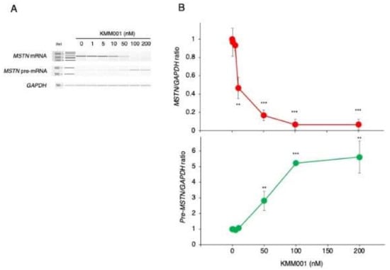 2.4. KMM001 Decreased Mature mRNA Levels in a Dose-Dependent Manner and Reciprocally Increased Pre-mRNA Levels