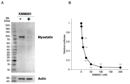 2.6. KMM001 Inhibited Myostatin Protein Expression in CRL-2061 Cells