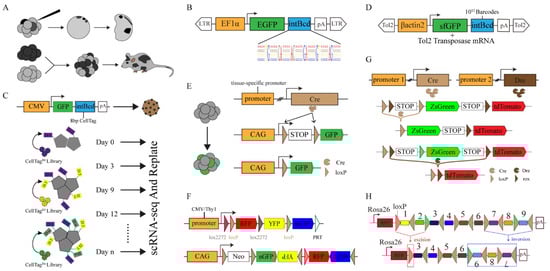 CbLT provides a high degree of dynamics to reconstruct developmental lineages. However, the same editing results can lead to the same labeling of very different cells. Chan et al. combined different dynamic barcodes and add eight base-integrated barcodes upstream of variable barcodes to distinguish the editing results of barcodes [33] (Figure 3F). Their results show that endodermal cells from different origins have nearly identical transcriptomes, which supports previous observations [33,50]. Recently, He et al. developed the iTracer recorder by combining a static barcode with CRISPR-based dynamic barcoding, which was compatible with single-cell and spatial transcriptomes. Afterward, they used this method to explore the clonicity and lineage dynamics during the development of cerebral organoids, illustrating the changes in the cell fate and cell lineages during the formation of cerebral organoids [35]. The initial state of lineage information recording limits the application of CbLT in adult individuals because the microinjection or hybridization of barcode editing cannot control this initial state flexibly. Controlled barcode editing was achieved by the hybridization of mice, which induced Cas9 expression by Dox (Doxycycline) with CARLIN (CRISPR array repair lineage tracing) [32] (Figure 3G). This system was used to investigate the differences in the clonal activity of fetal liver HSCs and revealed a previously undiscovered clonal bottleneck in the response of HSC to injury. This approach can induce the barcode editing of living organisms’ lifecycles. Compared with the early CbLT, these methods improved the controllability and diversity of barcode markers and laid a foundation for the genealogy reconstruction of mammal life activities.