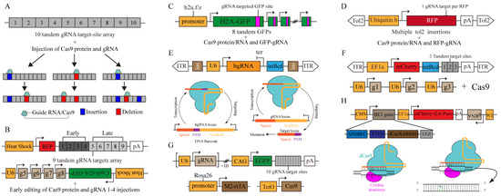 To address these issues, scGESTALT (single-cell GESTALT) combines DNA barcoding with scRNA-seq to track cell lineage relationships and cell identity (Figure 3B). The expression of Cas9 activity was induced using a promoter activated by heat shock, and long-term editing was achieved [27]. The latest version of this strategy has been applied recently to map a family tree of zebrafish and its brain development [48]. In addition, an approach called ScarTrace that targets transgenic tandem fluorescent proteins has been developed using gRNA to generate barcodes, record lineage information and distinguish the efficiency of barcode generation using fluorescence intensity [28] (Figure 3C). These methods form barcodes by concatenating multiple edit areas. Then, the method deletes large fragments, leading to a loss of record lineage information. In response, LINNAEUS (lineage tracing by the nuclease-activated editing of ubiquitous sequences) disperses target sites across the genome and solves the problem of information loss caused by the deletion of large fragments [10,29] (Figure 3D).