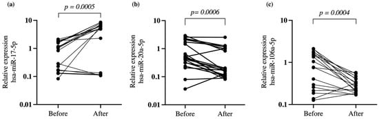 2.2. Atorvastatin Modulates the Expression of miRNAs hsa-miR-17-5p, hsa-miR-20a-5p and hsa-miR-106a-5p in Hypercholesterolemic Patients