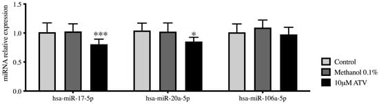 2.3. Atorvastatin Decreases the Expression of miRNAs hsa-miR-17-5p and hsa-miR-20a-5p in HepG2 Cells Treated with Atorvastatin 10 μM